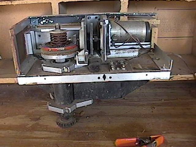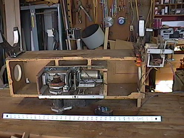 Pierre has left us, but his legacy lives on in his myriad optical creations. This page will chronical the rebuilding of one of them-his motorized, 8" F/4 binocular chair. I happened onto it during one of the first SAC ATM meetings. A lot of Pierre's equipment and supplies were left behind. Some were brought to the metting for input on what to do with it. Someone was suggesting we split the optical tube assemblies into two 8" F/4 Dobs to be used as club scopes for newbies. I found this idea abhorent, so I volunteered to take it all home, evaluate its disposition and refurbish it if possible. I had a plan to install it in the rolloff roof of my Stone Haven Observatory, for use by visitors to star parties I regularly give. It's only been recently I've been able to find the time to look into the restoration. I believe I'll have most of the materials I need on hand, but some restoration of the building is now in order. More on that later. In the mean time, I'll take pictures of the chair in its present state and as it gets fixed. I'll also be entering the plans into a CAD program to document all dimensions and so on. I hope you're sitting comfortably...