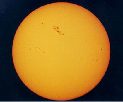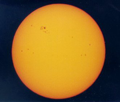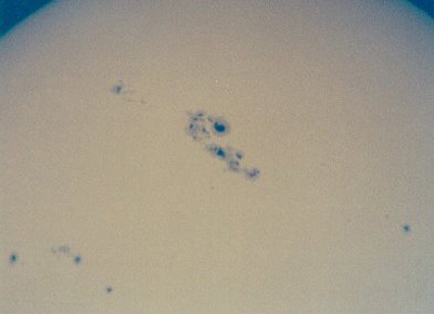 The sunspot group comes over the limb. This shot was taken on Monday, 3/26/01. The next day, the big spot looked like this. Note how close it is to the center of the disk. This is an eyepiece projection closeup of the big spot, taken 3/28/01 about 4:45 pm MST.