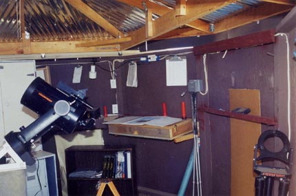 Looking SW. Nice view of the scope and benches along the wall. Filing cabinet sits under the hutch. Hanging on the wall is the dew heater described in the guestbook. While you're there, why not sign it!? |