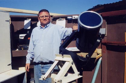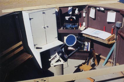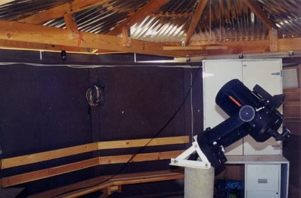 This is a picture of the inside of Stone Haven Observatory as seen from a step ladder looking Southeast over the wall with the roof retracted. It clearly shows the new benches along the South wall, the door to the left, the C8 mounted on the pier and my sweetheart, Rosie. Just above and to her left is visible the power outlet and brackets used for the fan that's installed in the summer. This fan isn't so much to cool the scope as it is to cool the astronomers. It is Sonoran Desert, after all. :-) |