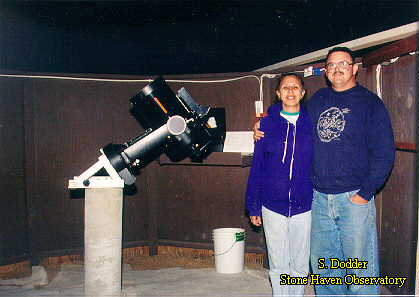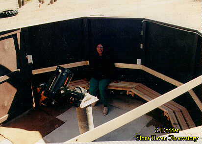 Here's a picture of me, my wife Rosie and my C8. It was taken inside Stone Haven, well after dark. (Here's a little advice-take pictures such as this while it's still light outside. The flash necessary to take this shot was borderline painful! Notice how she's the smart one here-her eyes are closed!) This was taken before the roof was installed, but you can see one of the rails I used above my head. (It ened up going left to right in this view.) You can get an idea from this shot how roomy the observatory is. There is just as much room to the left of the pier as there is to the right. |
