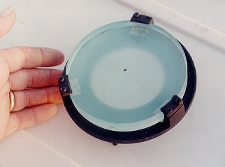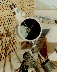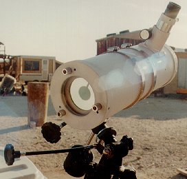 Please remember to be EXTREMELY CAREFUL when attempting to observe the sun! Any mistakes can cause instant, permanent damage to your eyes.I received the following email from a person I'd had a conversation with on the IRC chat room #Sciastro. I thought I'd turn my reply into a separate page in case anyone is interested in making their own solar telescope. Just be sure to follow the instructions carefully and precisely and feel free to contact me for advice or specifics. Illustrations are forthcoming, as soon as I get them scanned. Hi there..... Excuse me if I've double posted this request, but could you give me more detailed instructions regarding the solar scope we discussed (or rather, you discussed) tonight in sciastro???????? : )~ I appreciate it : ) Karma I'd be delighted, Karma, but I guess I should start more or less at the beginning for those that missed the conversation. I apologize in advance for the length of this post. I entered in the middle of the conversation, but essentially you said you were looking for a way to project the sun's image so you could sketch sunspots. I asked if projection was mandatory, or if you just wanted to observe the sun. You said just observe, and someone else was suggesting making a full aperture solar filter. You also stated you had a 4.5" F/9 reflector in mind for the project. This is pretty much where my ears perked right up. :-) I mentioned I had a solar telescope of a design by Rik Hill, one of the coordinators of the solar section of the American Lunar and Planetary Observers, (ALPO). Mine consists of a 4.5" F/4.5 equatorially mounted Newtonian reflector telescope from Tasco, (his is a 6" F/9) with no coatings on the mirrors whatever, just polished glass. (I was able to remove the coatings by immersing the mirrors in a solution from Radio Shack called Ferric Chloride. It's used to etch excess copper from electronic circuit boards. It took about 20 minutes.) "Mirrors" like this reflect only 4% of the light hitting them, thus the total light transmitted to the eye piece is only 0.16% of the light from the sun. This is right on par with the amount transmitted through full aperture filters. (My Thousand Oaks Type II I use on my C8 transmits 0.14%.) You can hold your hand right at the focus of this solar scope and feel no heat from the image at all. The only risk, and it is considerable, is from ultraviolet and infrared wavelengths. These are in turn blocked by a filter fashioned from #8 GREEN welders glass cut and shaped to fit in a standard screw on eyepiece filter holder. (I used a #80 blue filter. Remove the retaining ring from underneath the filter and the filter will drop out. Use this as a template for the new green filter. You can cut the glass close to size with a Dremel tool fitted with a diamond cutting wheel. (They're the grey ones.) Final shaping I did with a knife sharpening stone in a bowl of water while I watched the news on TV. Rounding the edges to size took a couple hours. Place it in the filter holder, replace the retaining ring and presto!) You MUST use the green glass, not the gold plastic. Several people in the know beat me up pretty good about this. Seems the gold, easy to use stuff does not reject infrared radiation sufficiently. The green, hard to shape glass does. NO CUTTING CORNERS HERE! Your eyesight is too important to play with! So, once the glass parts are assembled, you should paint the back of the secondary flat black, plus the secondary holder, along with the side (front?) of the mirror cell that faces the sun, and the inside of the telescope tube, making certain to coat the side opposite the eyepiece. The outside of the scope can be painted white or left alone, whatever you choose. (I find the white tube stays cooler when I move the scope around, but it's not that important.) Wait for the paint to dry, put it together, collimate it and you're ready for first light. It's easy to find the sun with this scope because, as I said, most of the light goes right through. This leaves a distinct shadow of the secondary on the primary. Simply align the shadow with the center of the primary and there it is. On first look, I'd recommend just taking out the eyepiece and holding your hand up to the focuser. You should just barely see the light from the sun on your hand.It shouldn't be much brighter than ambient light. If this is what you see, go ahead and screw the filter on a medium wide angle eyepiece, (I use my 18mm, but my scope is only an F/4.5. You may select another one, perhaps a 25mm or so.), and give it a shot. The sun will appear green, but it should come nicely to focus, revealing all manner of high contrast details. This about covers it. If you have ANY other questions or concerns do not hesitate to ask me! If I don't know the answer, I can find out from the source just what the answer is. PLEASE DO NOTHING UNTIL YOUR QUESTION IS ANSWERED. I don't mean to shout, but the importance of proper operation of this telescope is critical. Depending on the scope, there are also a number of contrast improvements to check for, but get the thing to this stage first, and I can ask you to check certain details for improvement later. I sure hope this helps, and that you'll remeber to be safe when viewing the sun, and not to hesitate at all in asking questions, ok? Clear skies, day and night! Astroman Copyright 2000, Steve Dodder Webmaster: Steve Dodder Revised: 5/25/11 |