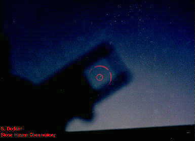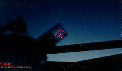 Thisis a view of the conjunction of Venus and Jupiter as seen through the famousTelrad finder "bullseye". It was taken with a Canon A-1 camera bodythrough a Tokina 70mm zoom lens on Kodak Gold Max 800 speed film atF4.0 in 1/4 of a second on February 23, 1999 at approximately 7:15 PM. It seemed like the artsy thing to do at the time....The stats are essentially the same for all three shots on this page. |